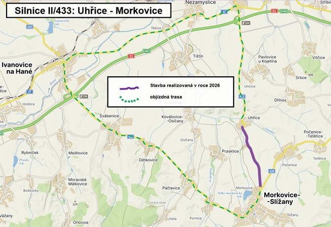 Úplná uzavírka rozdělí rekonstrukci na dva úseky. Nejprve přijde na řadu část mezi Uhřicemi a osadou Pančocha. Druhá etapa se zaměří na pokračování směrem do Morkovic-Slížan. Objízdná trasa povede přes Mořice, Nezamyslice, Ivanovice na Hané, Švábenice a Pačlavice.