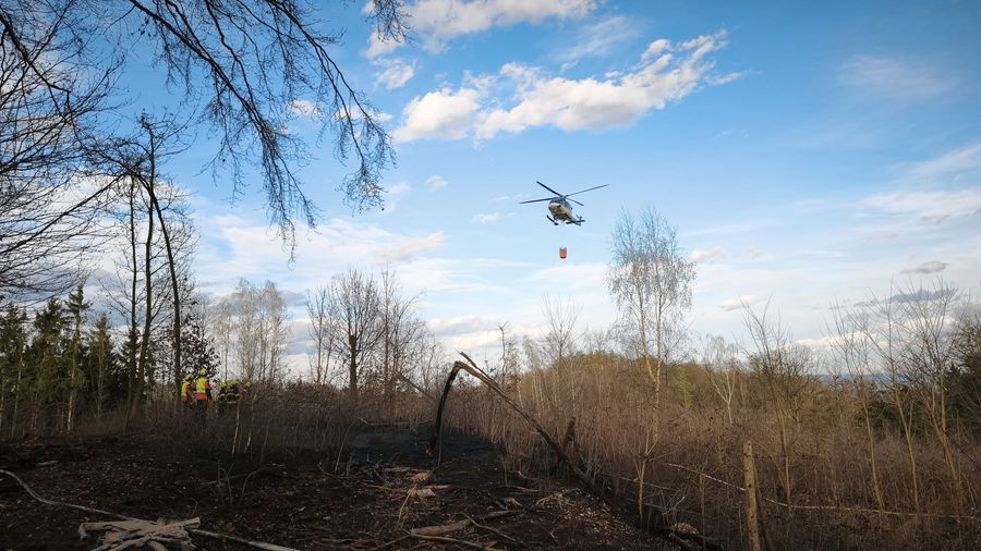 Náročný zásah si vyžádal i leteckou podporu. Vrtulník s bambivakem provedl celkem 18 shozů vody a pomohl hasičům zpomalit šíření požáru.