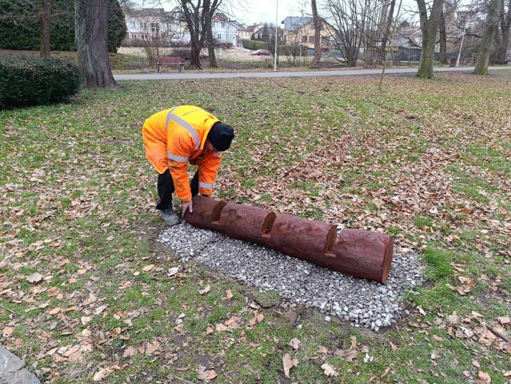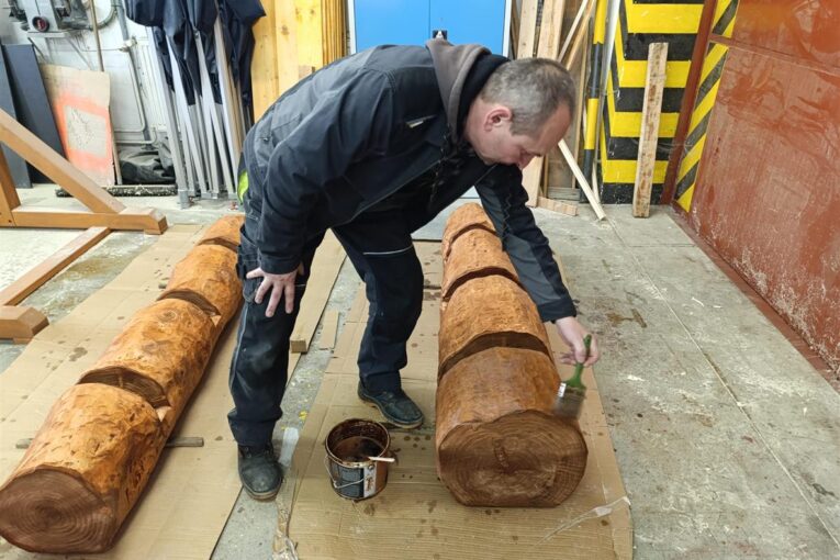 Po skončení sváteční sezóny byl strom převezen do areálu technických služeb, kde se pracovníci pustili do jeho dalšího zpracování. Z nejmohutnější části kmene oddělili dva kusy, z nichž vznikly stojany na kola. Dřevěné segmenty prošly pečlivou úpravou v truhlářské dílně – nejprve byly odkůrovány a následně ošetřeny ochranným nátěrem, který prodlouží jejich životnost.