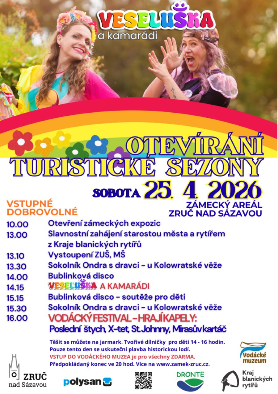 Slavnostní otevírání turistické sezony začne v sobotu 25. dubna 2026 v 10 hodin v areálu zručského zámku. Program zahájí zpřístupnění zámeckých expozic, které postupně vystřídá pestrá přehlídka vystoupení, her i zážitků. Těšit se můžete na oblíbené hudební vystoupení Veselušky a kamarádů, sokolnickou show i doprovodný program včetně bublinkové diskotéky a vystoupení dětí z místních škol.