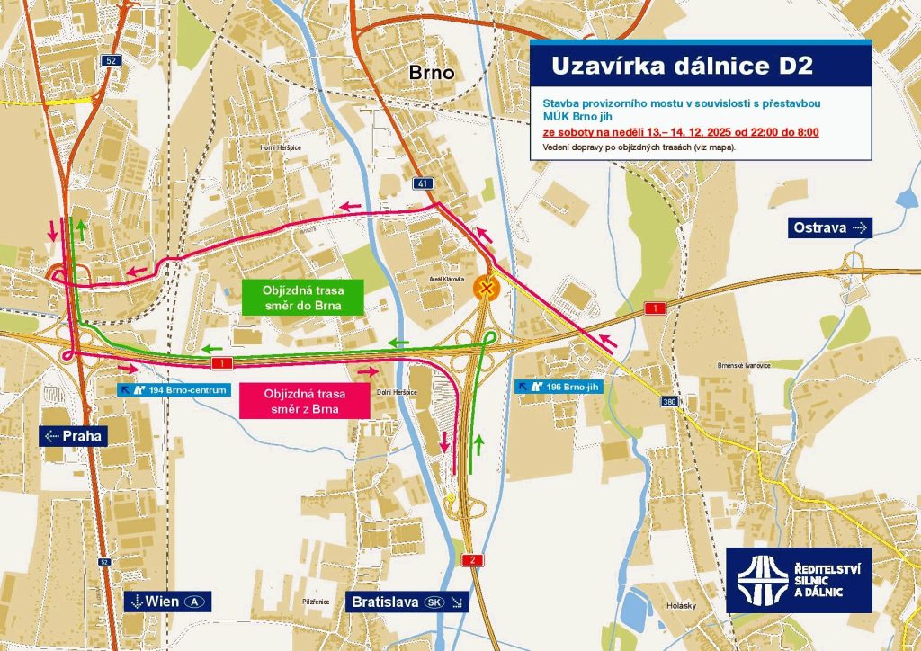 Sjezd z D2 ve směru na Brno bude možný pravým souběžným jízdním pruhem a nájezdem na D1 a Vídeňskou ulici (viz mapka níže). Objízdná trasa ve směru z Brna na Bratislavu povede v noci ze soboty na neděli ulicemi Kaštanová, Hněvkovského, Sokolova, Bohunická a Vídeňská. „Další úplnou noční uzavírku dálnice D2 plánujeme v polovině ledna 2026. Přesný termín včas upřesníme. Řidičům doporučujeme věnovat zvýšenou pozornost dopravnímu značení,” uvedlo ŘSD na své stránce.