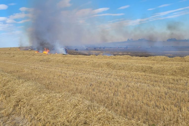 FOTO: U požáru svinovacího lisu na Opavsku zasahovalo devět jednotek hasičů. Oheň se šířil dál na pole