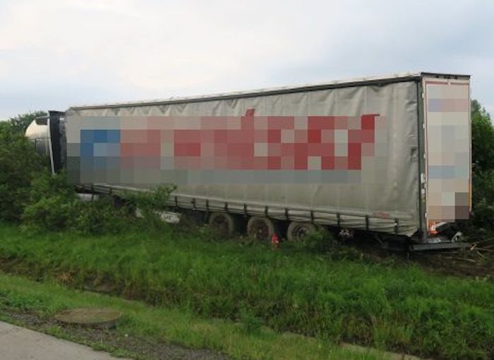 Převrácený kamion plně naložený řepou zablokoval D 35 u Olomouce. Řidič zůstal viset v mezeře na mostě