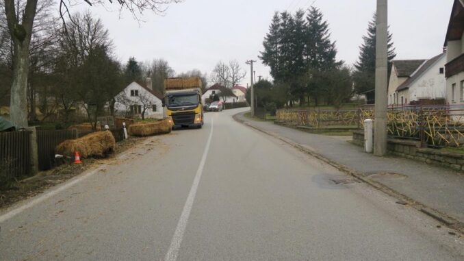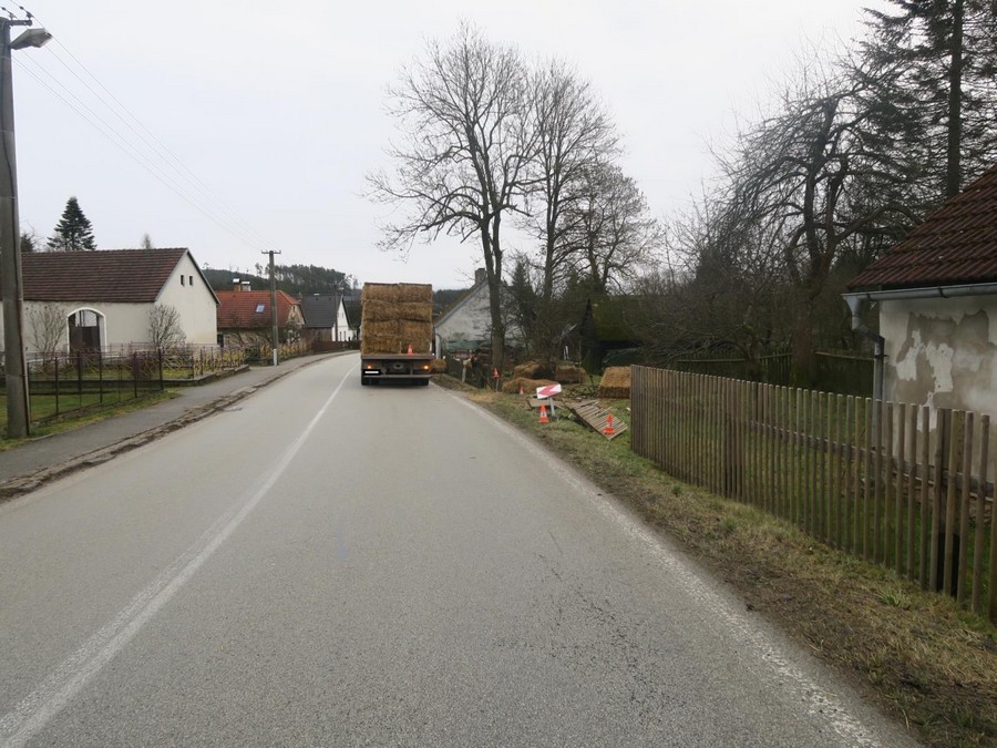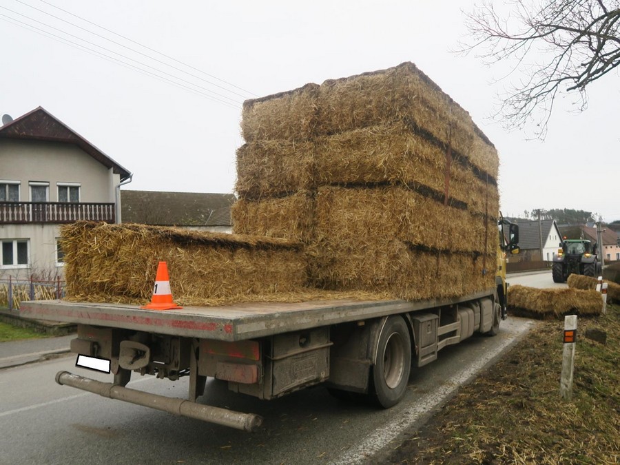 Jak informovala policejní mluvčí Věra Mžiková, v pátek před osmou hodinou ráno došlo v obci Valtínov k dopravní nehodě z důvodu nedostatečného upevnění nákladu. „Devětatřicetiletý řidič nákladního vozidla Volvo projíždějící obcí Valtínov ve směru na Dačice při jízdě z mírného kopce nepřizpůsobil rychlost jízdy, čímž došlo k uvolnění nedostatečně zajištěných balíků slámy,“ popsala mluvčí.