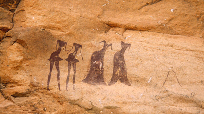 My se ale obraťme k jiným mytickým bytostem, označovaným jako „kulatohlaví“. Byly zobrazeny před 9000 lety na stěnách roklí alžírského pohoří Tassili. Jsou to velké bytosti, vysoké mnoho metrů.