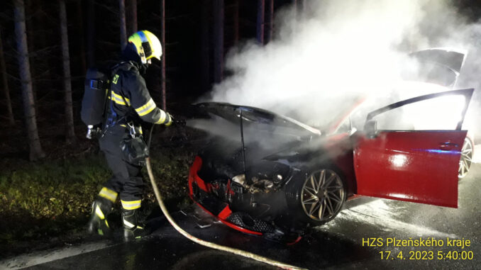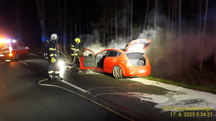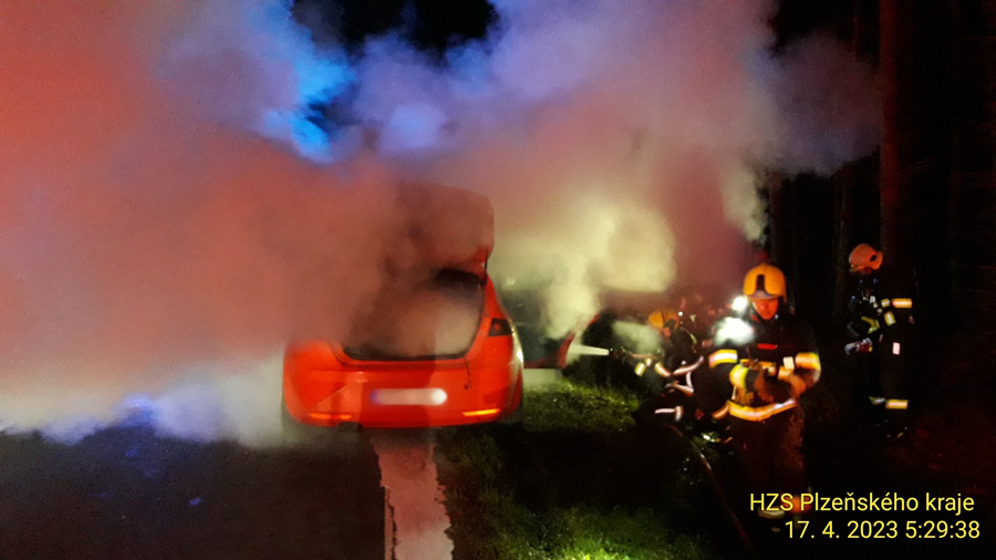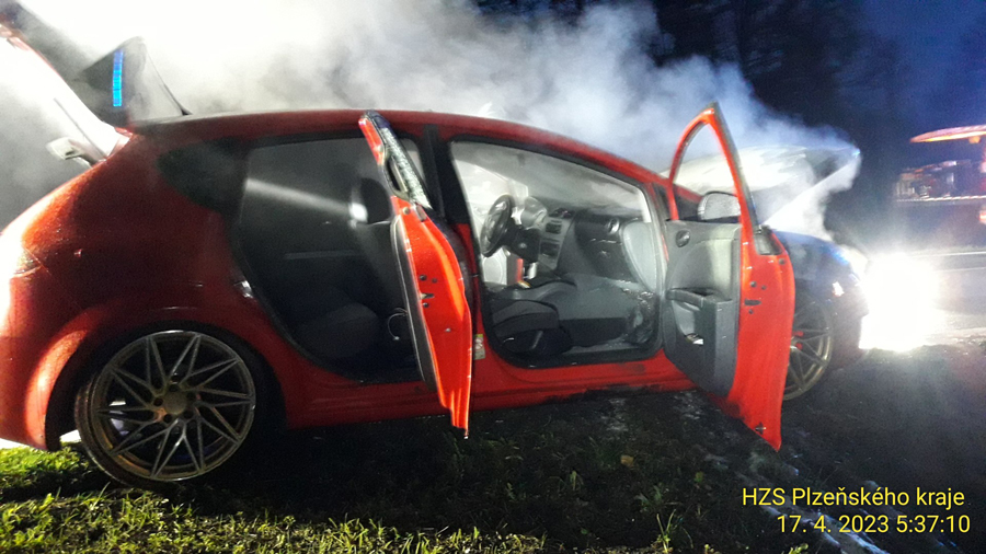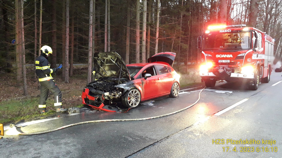 Vzňalo se tam náhle osobní auto. Oheň zasáhl motorovou část. „Výše škody je 150 tisíc korun. Příčinou byla technická závada,“ informoval mluvčí hasičů Petr Poncar.