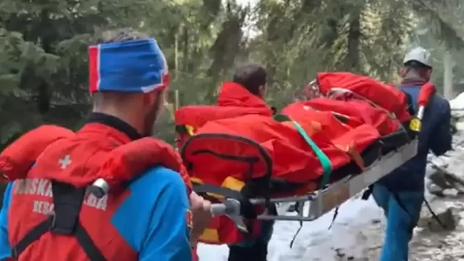 Z místa ji horští záchranáři v nosítkách přenesli na místo, kde mohl bezpečně přistát vrtulník. Nejdříve však museli použít dýmovnici, aby posádka vrtulníku věděla, kde má přistát.