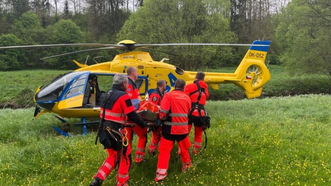 „Po příletu nad místo události bylo nutné pacienta s pozemními záchranáři lokalizovat a obhlédnout terén, který sestával ze vzrostlého lesa, svahu, křovinatých porostů a velmi úzké stezky svažující se k potoku. Po vyložení zátěže a vystrojení podvěsu se k pacientovi přímo z vrtulníku třicet metrů nad zemí slanil letecký záchranář společně s lékařem. Muže ošetřeného a zajištěného pozemní posádkou umístili do vakuové matrace a transportní sítě a vrtulník jej společně s leteckým záchranářem v podvěsu pod vrtulníkem transportoval k místu mezipřistání. Následně byl pacient naložen na palubu vrtulníku a převezen do českobudějovické nemocnice,“ popsala náročný zásah mluvčí jihočeské záchranné služby.