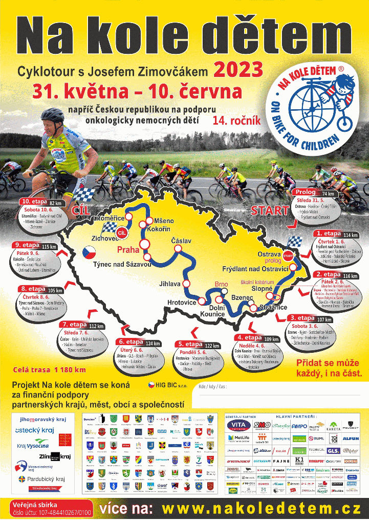 JIHOMORAVSKÝ KRAJ – Ve středu 31. května odstartuje již 14. ročník charitativní akce nadačního fondu Josefa Zimovčáka Cyklotour Na kole dětem. Jde o sportovní projekt na podporu onkologicky nemocných dětí. O již proběhlé charitativní akci nadačního fondu Josefa Zimovčáka Na kole dětem jihovýchodním Slováckem jsme psali v článku.