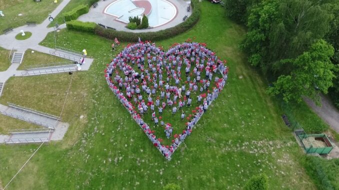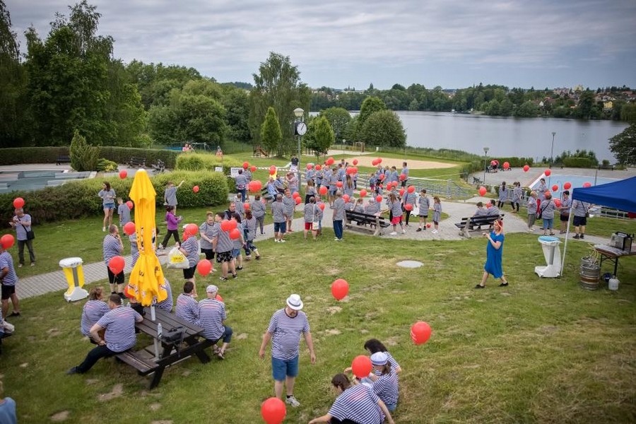 Potom, co všichni společně vytvořili obří srdce, vypustili do nebe červené balonky. „Ty byly z ekologického, v přírodě rozložitelného materiálu. Starosta města Michal Kozár, místostarosta Bohumil Komínek a velitel Sboru dobrovolných hasičů Lubomír Beran pak společně skočili do jednoho z bazénů a zahájili tak letošní koupací sezónu v aquaparku,“ popsala mluvčí radnice.