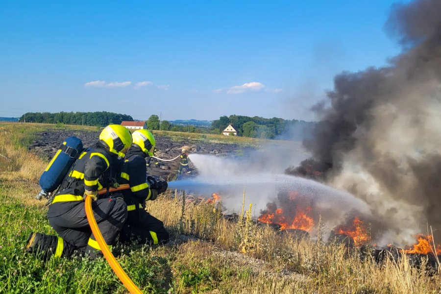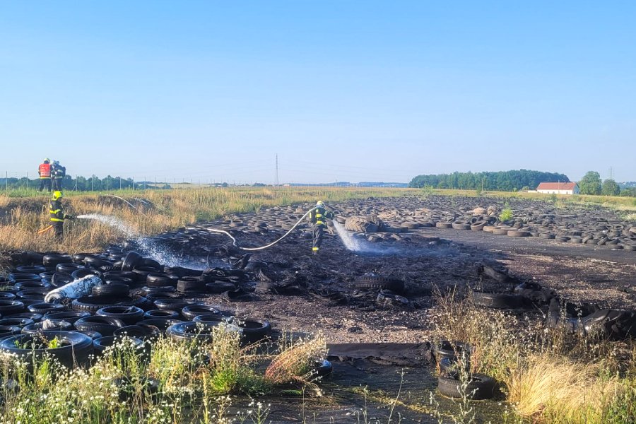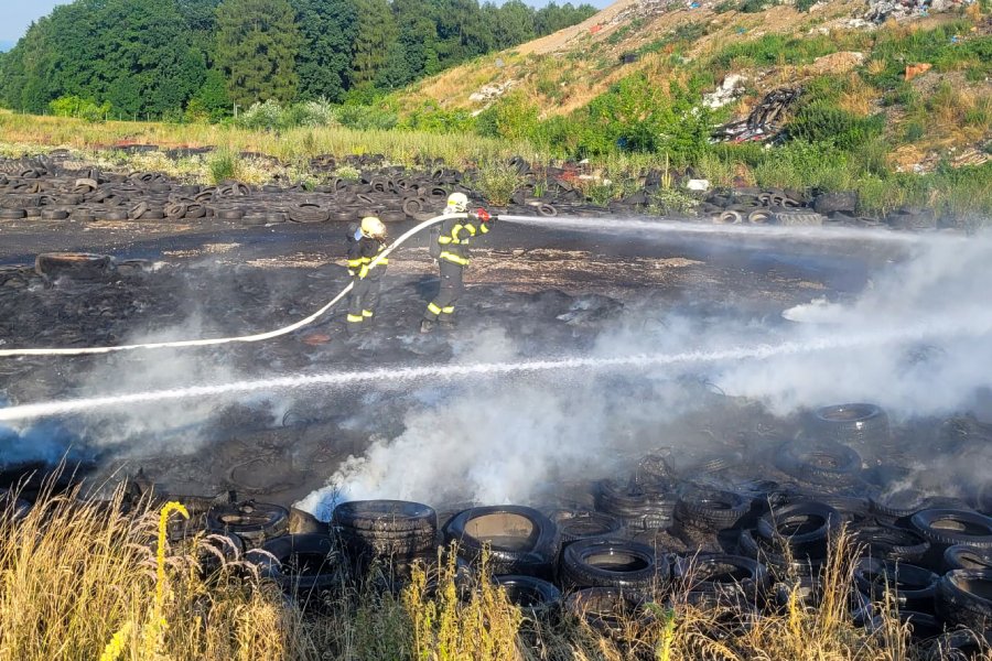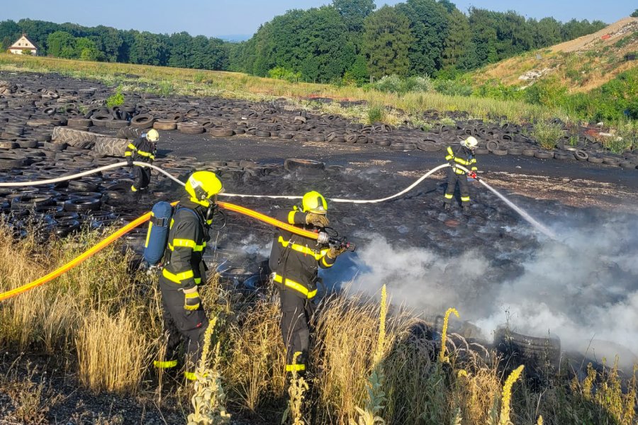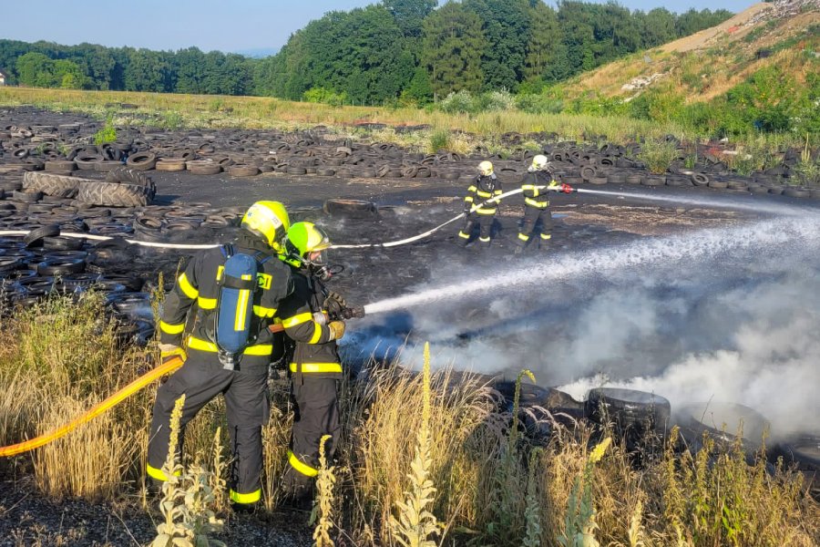 Po příjezdu na místo události hasiči zjistili, že se jedná po požár pneumatik na ploše 20×20 metrů. „K likvidaci plamenů nasadili celkem tři vodní proudy. Zásah jim komplikoval nejen kouř ale i vysoké okolní letní teploty,“ sdělila mluvčí hasičů Kamila Langerová.