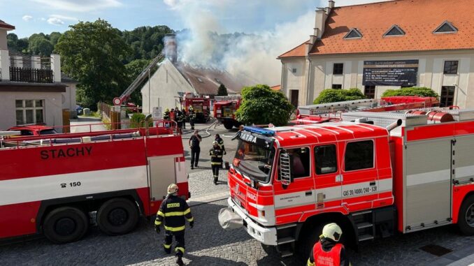 „Zásah je vzhledem k silnému žáru, kdy hasiči se průzkumem dostali pouze do poloviny schodiště, možný pouze vně objektu – střechou. Ta se přibližně po hodině částečně propadla, plamenné hoření stále pokračovalo. Až krátce před desátou hodinou se podařilo zastavit šíření požáru, velitel zásahu pak hlásil lokalizaci pět minut před desátou hodinou. Požáriště monitoruje také dokumentační skupina Hasičského záchranného sboru Jihočeského kraje dronem s termokamerou. V tuto chvíli bude celá střecha rozebrána a řádně dohašována,“ uvedla mluvčí hasičů.