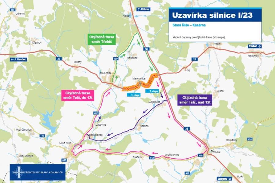 Vozidla do 12 tun využijí silnici I/38 po křižovatku se silnicí II/410 v Želetavě – dále pojedou přes Jindřichovice, Zdeňkov až po křižovatku s II/407 v Nové Říši a odtud přes Bohuslavice do Staré Říše.