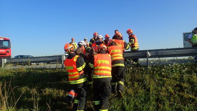 KROMĚŘÍŽSKO – Únava překvapila řidiče, který se s rodinou vracel z letní dovolené. Havaroval na dálnici D1 u Hulína a zůstal zaklíněný ve voze.