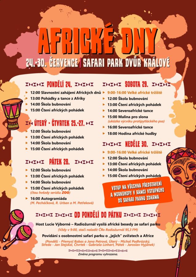 TRUTNOVSKO – V pondělí 24. července startují oblíbené Africké dny. Hned v pondělí představí safari park společně se Safari Gastro novou africkou kávu, jejíž konzumací budou lidé podporovat záchranu zeber v Ugandě. Až do neděle na příchozí bude čekat pestrá směs africké kultury, gastronomie a všeho dalšího, co k Africe patří. Fanoušky seriálu ZOO potěší i autogramiáda jeho protagonistů.