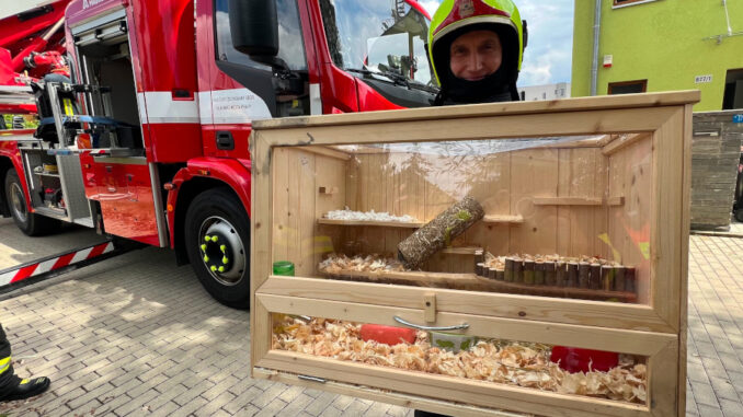 Jeden z hasičů z hořícího domu zachránil křečka i s jeho důmyslným příbytkem. / Zdroj: Hasiči Praha