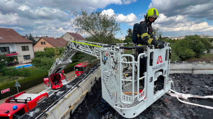 Hasiči museli při zásahu použít i výškovou techniku. / Zdroj: Hasiči Praha