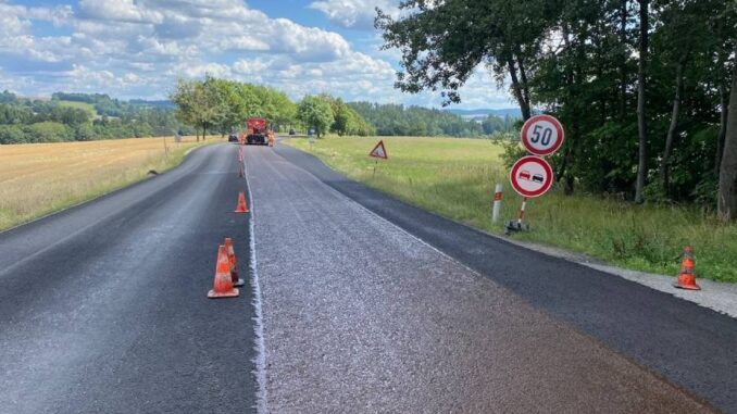 ŽĎÁR NAD SÁZAVOU – Na silnici I/19 u Radňovic na Žďársku dokončují silničáři pokládku mikrokoberce a protismykové vrstvy. Po necelých dvou měsících intenzivních prací, kdy zde dopravu řídily semafory, by měla být silnice během příštího týdne již průjezdná bez čekání.