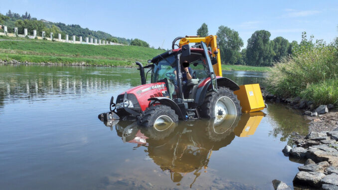 PRAHA – Zajímavý pohled se naskytl lidem, kteří v pondělí kolem jedné hodiny procházeli nebo projížděli okolím Trojské lávky v Praze 8. V korytě řeky tu vězel traktor i s řidičem! Co se na místě stalo?