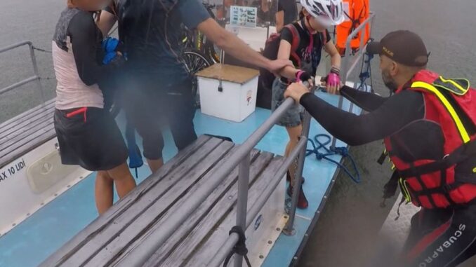 Uniformovaní se okamžitě vydali nalézt plavidlo. Dohledání lodi ztěžoval kolísavý mobilní signál, silné vlny na hladině, a neustávající déšť. „Díky místní znalosti zvolili policisté správný směr a v krátké době již přívoz spatřili. Na lodi byla žena, vůdce přívozu, a cestující sleženi ze tří dospělých a jedné holčičky. „Měli s sebou kola. Vzhledem k původnímu krásnému počasí byli jen lehce oblečení, což mělo za následek, že úplně vlivem špatného počasí promrzli.