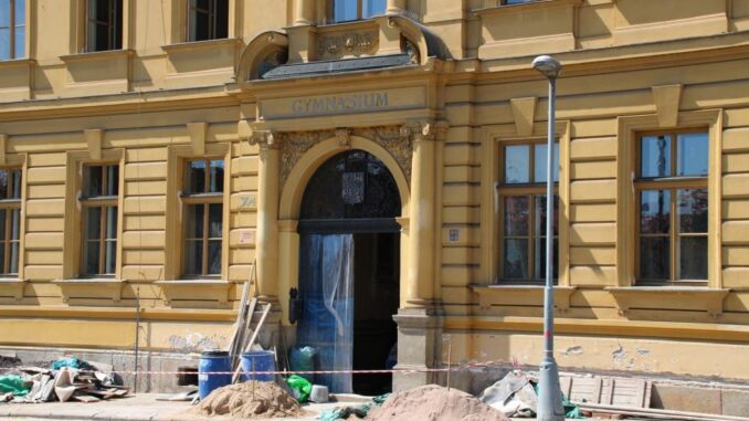 I v současných dnech ještě probíhá oprava vestibulu v budově gymnázia ve Dvoře Králové nad Labem. Termín dokončení stavebních prací byl prodloužený do konce září. Dělníci také pracují na výměně dubových parket ve dvou učebnách. Ačkoli je zřizovatelem Královéhradecký kraj, budova je v majetku města a všechny pracovní postupy jsou konzultovány s vedením gymnázia. „Termín dokončení prací byl posunut, protože kvůli nucené změně technologie odvlhčení zdi práce zasáhly do dvou přilehlých místností, a to do chemické laboratoře a do knihovny,“ dodává za město Ctirad Pokorný.