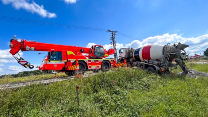 SEDLIŠTĚ – Dopravní nehoda domíchávače plného betonu uzavřela silnici v Sedlišti. Soukromé firmě se vůz nepodařilo vyprostit, museli pomoci hasiči.
