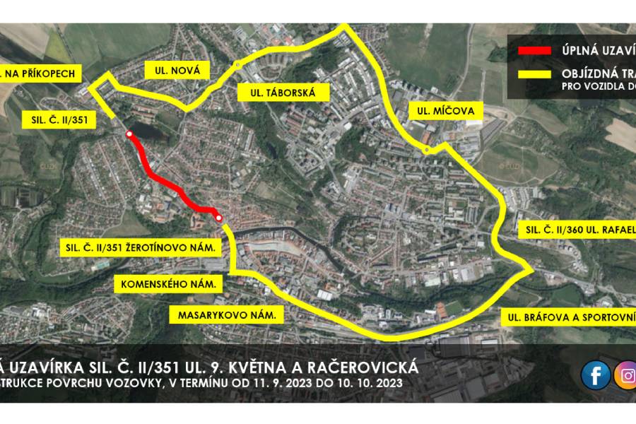 Vozidla do 3,5 tuny budou uzavřený úsek objíždět ulicemi Žerotínovo nám., Komenského nám., Masarykovo nám., Bráfova třída, Sportovní, Rafaelova, Míčova, Táborská, Na Příkopech.