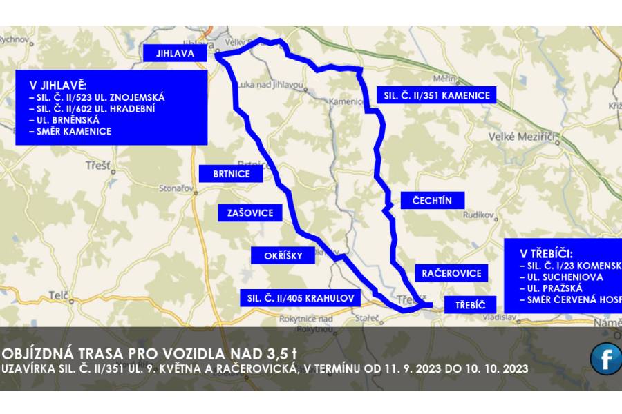 Pro auta nad 3,5 tuny je stanovena objízdná trasa ulicemi Komenského nám., Sucheniova, Pražská, Červená hospoda, Krahulov, Okříšky, Zašovice, Brtnice, Jihlava, Kamenice, Čechtín, Račerovice.