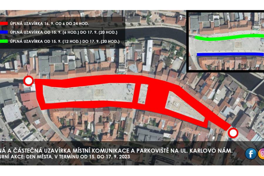Další omezení chystá město v termínu od 15. do 17. září na Karlově náměstí, důvodem je akce Den města. „Celé náměstí bude uzavřené v sobotu 16. září od 6.00 do 24.00. Horní strana náměstí v západní části bude uzavřena od 15. září od 6.00 do 17. září do 20.00, spodní strana od 15. září od 12.00 do 17. září do 20.00,“ vysvětlila mluvčí třebíčské radnice Irini Martakidisová.