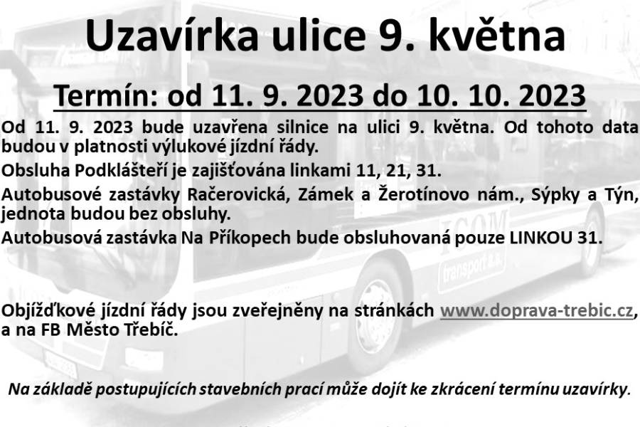 V době od 11. září do 10. října proběhne rekonstrukce povrchu silnice v ulicích 9. května a Račerovická. Po celou tuto dobu budou platit výlukové jízdní řády, řidiči budou využívat objízdné trasy.