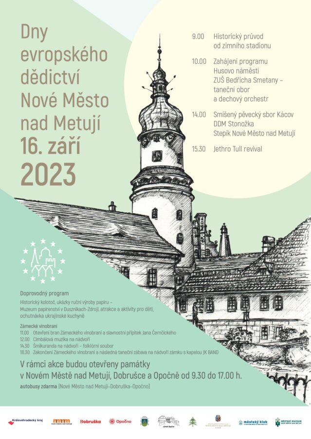 Sobotní program začne v Novém Městě nad Metují v 9 hodin historickým průvodem, který půjde od zimního stadionu v Krčíně na Husovo náměstí. Po celý den budou opět autobusy přepravovat návštěvníky po trase Nové Město nad Metují-Dobruška-Opočno zdarma. „Jízdní řád a podrobný program jsou přílohou zářijového čísla Novoměstského zpravodaje ve formě brožury, tu si můžete vyzvednou i v Informačním centru na Husově náměstí. Tato brožurka slouží zároveň jako soutěžní karta, se kterou v rámci razítkovací soutěže můžete získat zajímavé ceny,“ sděluje referentka Oddělení školství, kultury a sportu Nového Města nad Metují Eva Kupková.