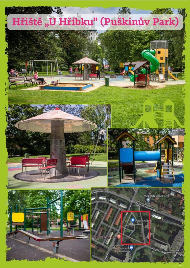 Vůbec první hřiště vznikala ještě u panelových domů, skluzavky a průlezky byly zejména z kovu. Pomalu dochází k jejich odstraňování, protože jsou často ve špatném stavu. Nejstarší hřiště, tak jak jsme na ně zvyklí dnes, vzniklo v roce 2002 u legendárního hříbku, v Puškinově parku. V roce 2020 nahradil starý hříbek, na kterém se protočilo mnoho dětí nový. Došlo také k rozšíření a zmodernizování samotného hřiště. Hříbek patří mezi nejvíce navštěvovaná hřiště ve městě.