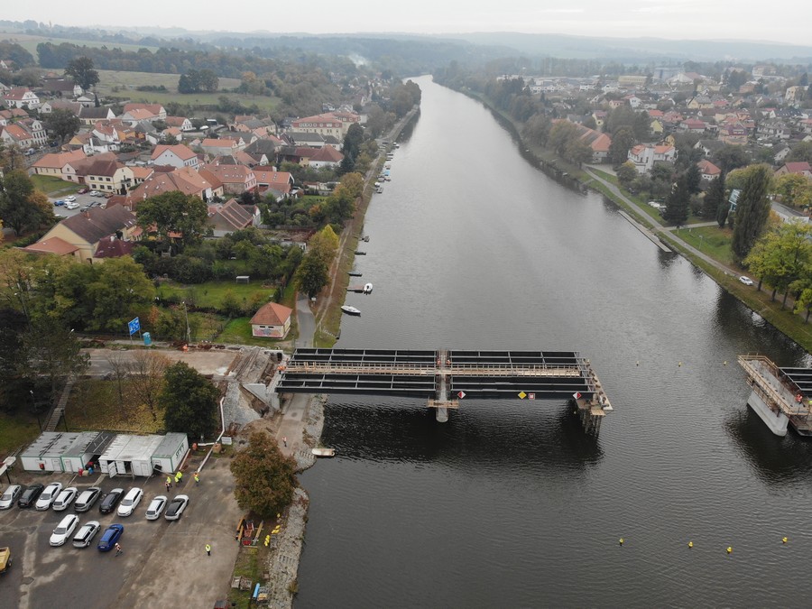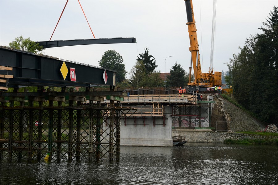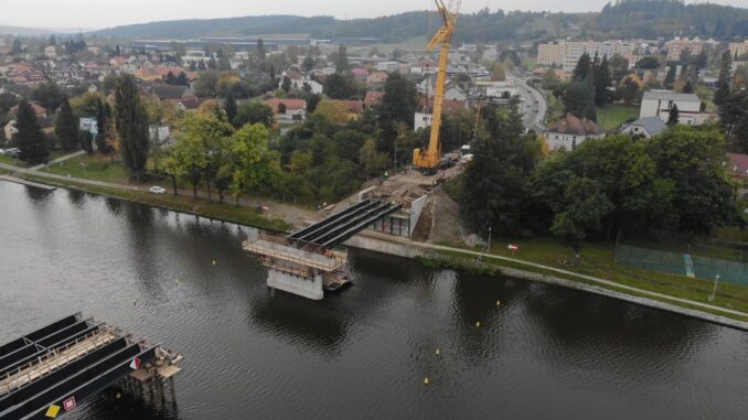 ČESKOBUDĚJOVICKO – Kompletní výměna mostu v Týně nad Vltavou pokračuje. Od poloviny října do poloviny listopadu probíhá montáž ocelových nosníků. Celkem bude na místo uloženo osmadvacet kusu nosníků, každý o váze 12 až 15 tun.
