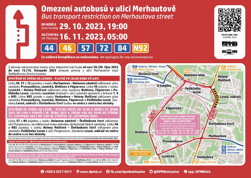 Omezení se dotkne také MHD: Od 19:00 v neděli 29. října do 5:00 v pondělí 30. října bude zcela vyloučen provoz mezi zastávkami Štefánikova čtvrť a Lesná, nádraží. Od 5:00 v pondělí 30. října 2023 do 19:00 ve středu 15. listopadu bude vyloučen provoz mezi zastávkami Štefánikova čtvrť a Lesná, nádraží ve směru na Lesnou. Další informace najdete na přiloženém obrázku.