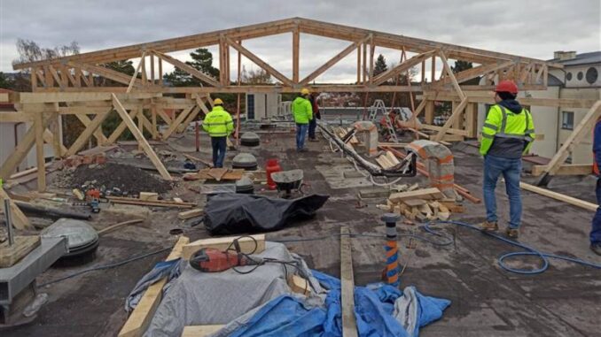 „Stavba je v současně době ve fázi přípravy rekonstrukce prostřední části střechy. Během opravy je nutné kompletně odstranit původní skladbu střechy a dostat se až na stropní podklad. Tato fáze bude náročná, protože se odehrává přímo nad prostory nově vystavěných laboratoří,“ vysvětlil technický náměstek novoměstské nemocnice Jiří Drdla.