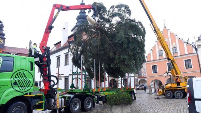 PELHŘIMOV – Před pelhřimovskou radnicí se od středečního dopoledne tyčí vánoční strom. Jeho cesta na místo nebyla dlouhá, pracovníci technických služeb ho pokáceli na ulici K. H. Borovského v Pelhřimově.
