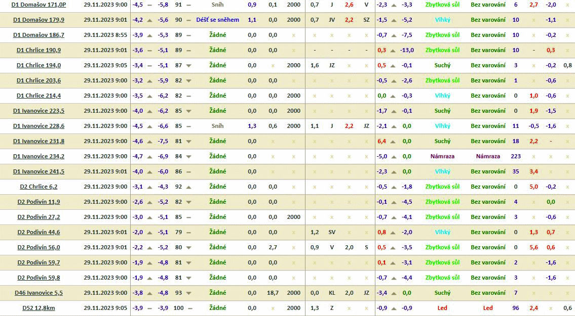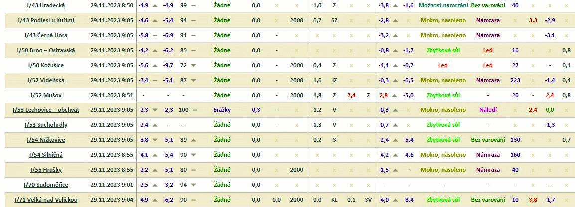 Jak uvedlo Ředitelství silnic a dálnic Jihomoravského kraje, aktuálně jsou dálnice a silnice I. třídy v Jihomoravském kraji sjízdné se zvýšenou opatrností. Hlavní tahy v kraji jsou nyní mokré a chemicky ošetřené. Varování před námrazou a náledím platí pro D52 na 12,8. kilometru a D1 na 234. kilometru, pro silnice I/54 u Silničné a I/55 u Hrušek (viz přehledy). „Jezděte opatrně,“ vyzvalo ŘSD.