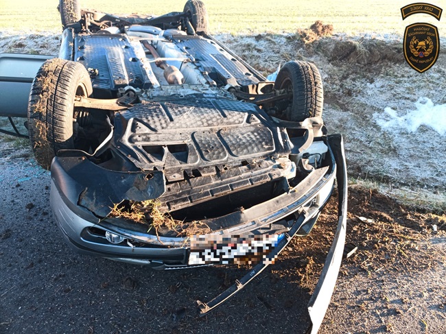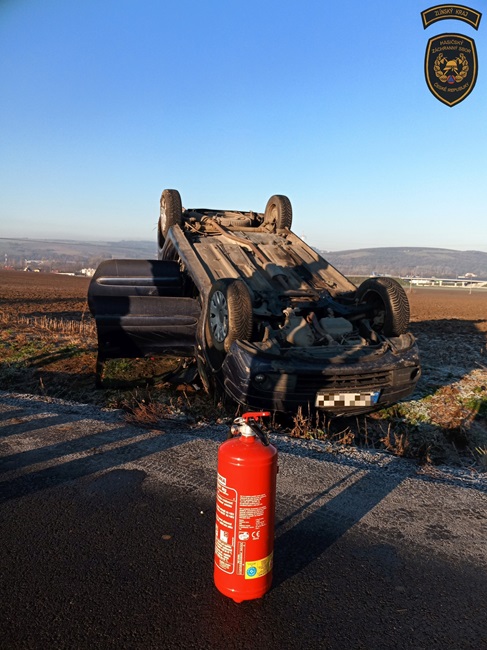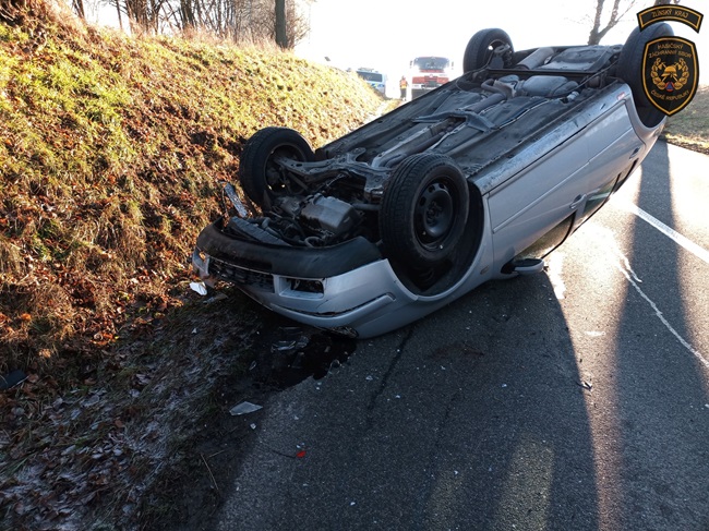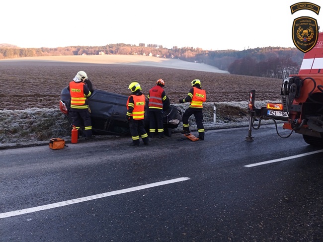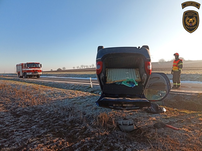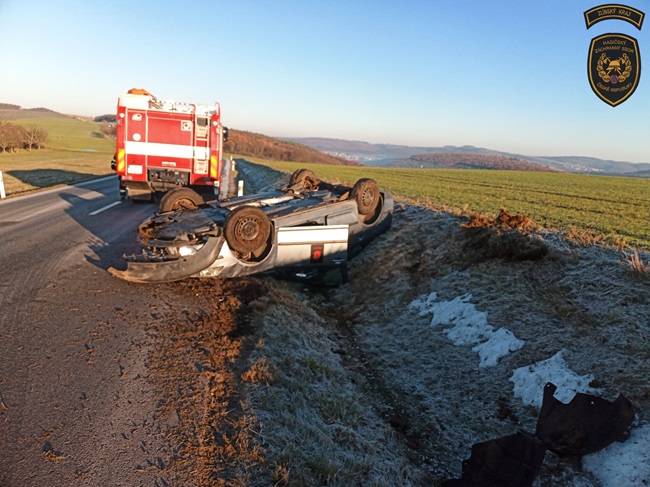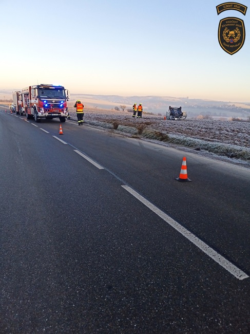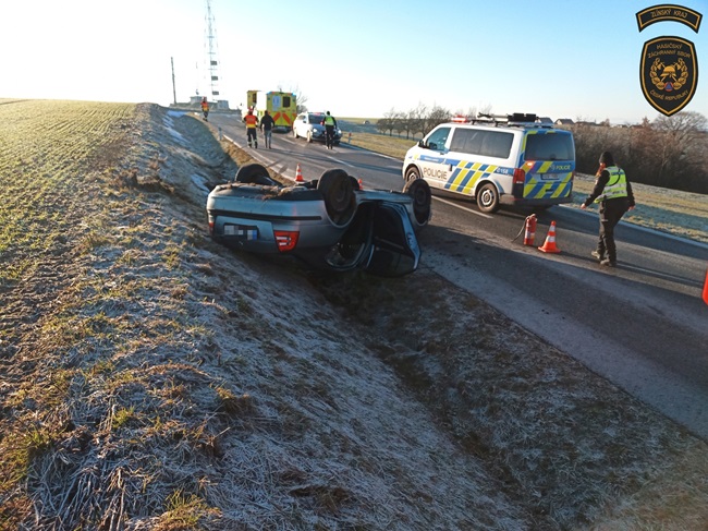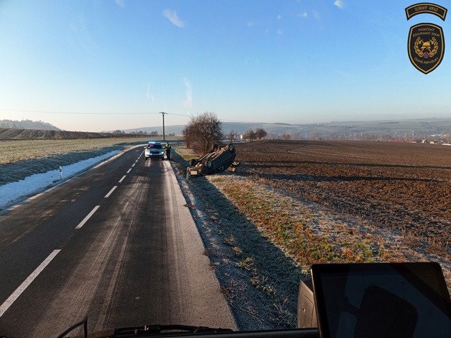 Další vůz skončil dnes dopoledne na střeše v příkopu, a to tentokrát u Velkého Ořechova na Zlínsku. „I zde byla namrzlá silnice. Obě ženy, řidička a spolujezdkyně, skončily v péči posádky zdravotnické záchranné služby,“ popsala Lucie Javoříková.