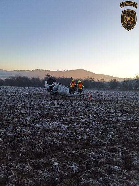 Další pondělní havárie osobního auta se stala u Koryčan na Kroměřížsku, kde řidička sjela mimo silnici a zůstala v poli s autem na střeše. V tomto případě se havárie obešla bez zranění.
