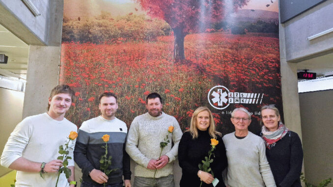 Na výjezdové základně v Brně-Bohunicích došlo ke šťastnému shledání pana Borise a jeho manželky Oldřišky se záchranáři, kteří byli při zásahu. Na fotce vidíte zleva záchranáře Štěpána Holáska, Pavla Plevu a Honzu Svobodu. Vedle něj stojí lékařka Eva Freyová, zachráněný pan Boris a jeho manželka Oldřiška. „Náš pacient šel k lékaři, protože měl delší dobu pocit chřipky či nachlazení, v čekárně náhle ztratil vědomí, následně došlo k zástavě oběhu. Když jsme přijeli na místo, navázali jsme na resuscitaci, kterou zahájila praktická lékařka. Péči jsme rozšířili, muže jsme zaléčili, zaintubovali a napojili na řízenou ventilaci. Podařilo se nám po společném úsilí obnovit oběh, následně jsme pacienta převezli na koronární jednotku Fakultní nemocnice u svaté Anny. Sama jsem překvapená, jak skvěle pan Boris po pouhých dvou týdnech od události vypadá. Máme s kolegy velkou radost,“ vyjádřila se Eva Freyová. „Moc všem zdravotníkům ze záchranky, ale i z nemocnice děkuji. Dík patří také manželově praktické lékařce. Všichni se zasloužili o to, že mám zpět svého muže. Zažila jsem hodně strachu, ale teď jsme nevýslovně šťastní. Ještě nás čeká dlouhá cesta zotavování, ale snad už bude jen lépe,“ dodala paní Oldřiška.