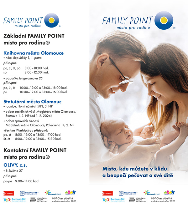 Takových Family Pointů zřizuje město Olomouc celkem pět: v pobočkách Knihovny města Olomouce na náměstí Republiky a v Jungmannově ulici, v budově radnice na Horním náměstí, nově ve 2. patře budovy NAMIRO v Palackého ulici a od letošního února i v prostorách odboru sociálních věcí ve Štursově ulici. „Hlavním cílem služby Family Point je poskytnout rodičům veřejný bezplatný prostor přátelský rodině, který poskytuje praktickou možnost přebalit, nakrmit své dítě, pečovat o něj, získávat informace a inspiraci pro podporu rodinného života nebo ho využít jako prostor pro setkávání a odpočinek,“ vysvětlila smysl služby náměstkyně olomouckého primátora Kateřina Dobrozemská.