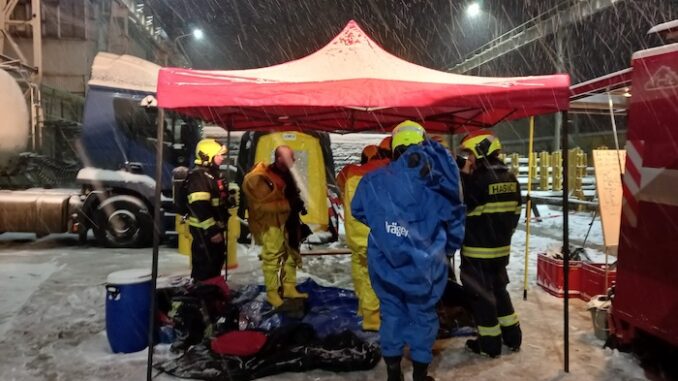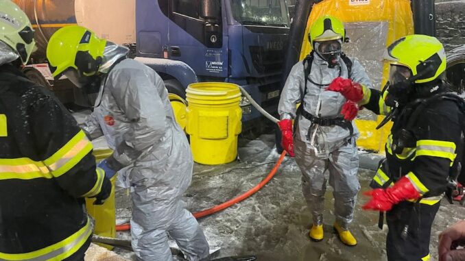 V jedné z průmyslových částí v České Vsi na Jesenicku došlo při čerpání kyseliny sírové k poruše sacího potrubí. „Následně z cisterny uniklo zhruba tisíc litrů do záchytné nádoby (lapolu). Z důvodu velmi nebezpečné látky je celý zásah prováděn s důrazem na bezpečnost v protichemických ochranných oblecích,“ informoval krajský mluvčí hasičů Zdeněk Hošák. U netradičního zásahu několik hodin zasahovali profesionální i dobrovolní hasiči. Došlo k částečnému úniku do stoku vedoucí do řeky Bělé. Hasiči po toku provedli několikanásobná měření s vyloučením možného vlivu na úhyn ryb v toku. O situaci informovali rovněž protistranu na hranici s Polskem. Hasiči také připravili kompletní dekontaminaci, včetně odčerpání kyseliny ze záchytného místa.