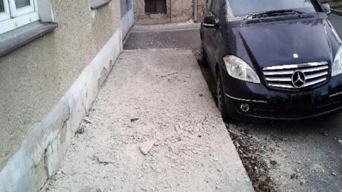 BRNO – Procházející Nováčkovou ulicí si všiml na zemi kusů omítky, která opadala z rohového domu. Materiálem bylo znečištěno i zaparkované auto.