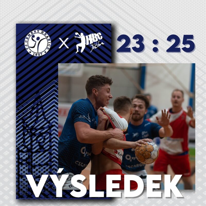 První branku střetnutí vsítil Thorovský, za domácí srovnával Kučera, 1:1. Podobný obrázek byl k vidění i v dalších minutách. Ani jeden z celků si nedokázal vypracovat vícebrankový náskok, hosty podržel v úvodu několikrát gólman Grabemann, na straně domácích úřadoval brankář Juráš. Skóre se přelévalo z jedné strany na druhou, ve dvanácté minutě upravoval na 4:5 J. Dolejší, o chvíli později otočili domácí na 6:5. Házenkáři Jičína poměrně dobře bránili, domácí se prosazovali jen velmi těžko. Hosté si dokázali v útoku připravit zajímavé střelecké příležitosti, s koncovkou se tentokrát ale trápili, byť na konci druhé desetiminutovky dokázal J. Hájek zvýšit na dvougólových 7:9. Cementáři ale ukázali, že to s ambicemi na dvoubodový zisk myslí vážně, znovu a křídelník Polášek upravoval v předposlední minutě na 12:11. Poslední slovo ale měl zkušený Kastner, jenž srovnal po individuálním průniku na poločasových 12:12.
