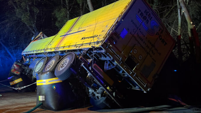 Z kamionu unikala do půdy nafta, velitel zásahu si proto na místo povolal pracovníky životního prostředí a Povodí Odry. „Po konzultaci situace jak s nimi, tak s policisty i majitelem kamionu, který se dostavil na místo, rozhodl velitel o postavení vozidla zpět na kola,“ doplnil Kozák. Na kola jej postavili hasiči z Ostravy-Zábřehu, kteří přijeli s vyprošťovacím speciálem Bison.