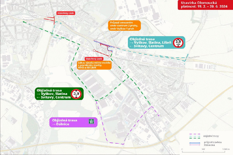 Od 19. února do 20. června 2024 čeká řidiče uzavírka na části Olomoucké a Ostravské. Olomoucká bude uzavřena v úseku od kruhového objezdu u Kauflandu po most přes železniční trať s výjimkou vozidel s povolením stavby a MHD a IDS JMK. Provoz na Ostravské v oblasti mostu Bělohorská bude omezen na dva pruhy ve směru centrum a jeden pruh ve směru na Vyškov. Dále bude uzavřená rampa ve směru z Ostravské na Bělohorskou.