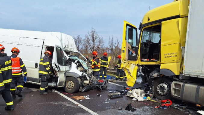 BŘECLAV – Ve čtvrtek krátce před polednem zastavila dopravu na silnici I/52 poblíž obce Perná tragická dopravní nehoda. Dodávka tam přejela do protisměru a střetla se s kamionem. Řidič dodávky střet nepřežil.