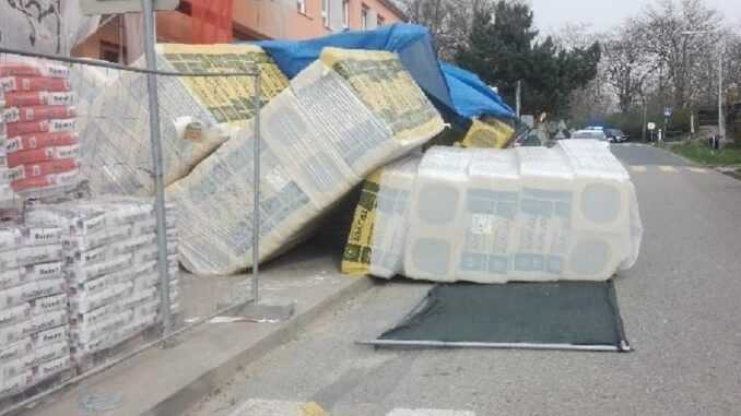 Téměř celou šířku jízdního pruhu zabralo stavební oplocení spolu s povalenými balíky izolačního materiálu. Věci se sesypaly v důsledku silného větru. „Přijeli jsme na místo, označili jsme ho jako překážku provozu a kontaktovali stavbyvedoucího. Ten na místo vyslal zaměstnance, kteří uvedli okolí stavbu do původní podoby,“ dodává tisková mluvčí městské policie Jana Pokorná.
