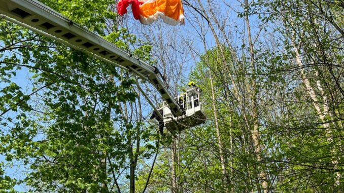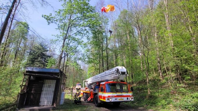 KOPŘIVNICE – Pomoc hasičů potřeboval paraglidista, který uvízl na stromě ve výšce patnácti metrů! Sundat jej museli za pomocí plošiny, naštěstí se mu nic nestalo.