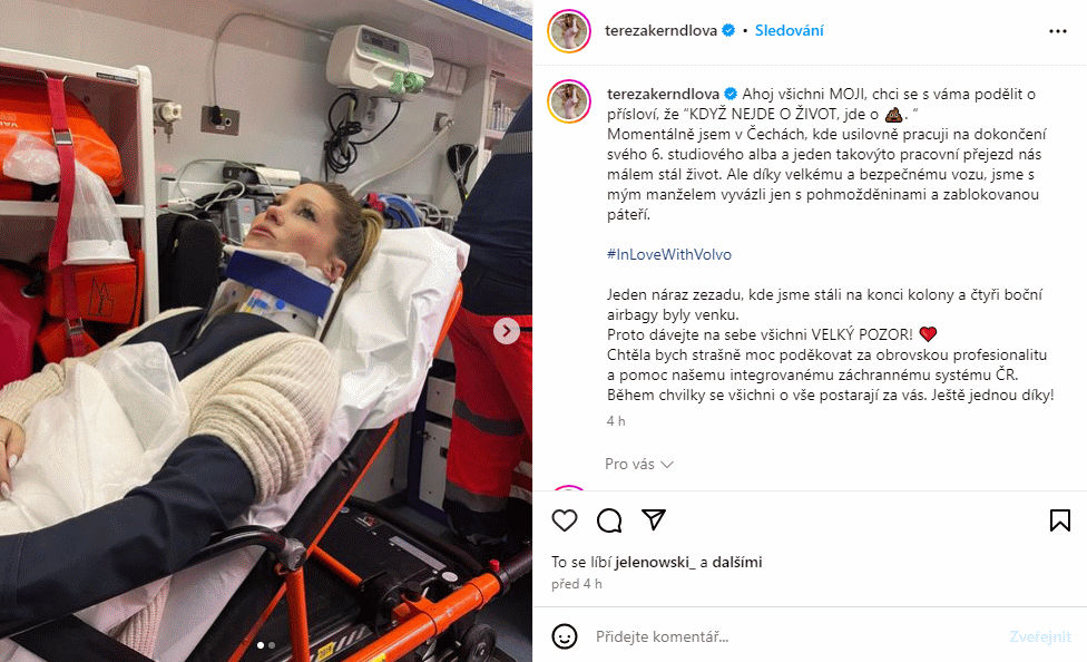 Známá zpěvačka Tereza Kerndlová měla v úterý krátce po půl sedmé hodině ráno dopravní nehodu u Lipůvky na Blanensku. Na svém Instagramu zpěvačka informovala, že jsou s manželem v pořádku a naštěstí prý vyvázli jen s pohmožděninami a zablokovanou páteří. „Momentálně jsem v Čechách, kde usilovně pracuji na dokončení svého 6. studiového alba a jeden takovýto pracovní přejezd nás málem stál život. Ale díky velkému a bezpečnému vozu jsme s mým manželem vyvázli jen s pohmožděninami a zablokovanou páteří. Jeden náraz zezadu, kde jsme stáli na konci kolony a čtyři boční airbagy byly venku. Proto dávejte na sebe všichni velký pozor! Chtěla bych strašně moc poděkovat za obrovskou profesionalitu a pomoc našemu integrovanému záchrannému systému ČR. Během chvilky se všichni o vše postarají za vás. Ještě jednou díky,“ popsala Kerndlová na svém instagramu. Sdílela tam i video z nehody. „Na místě jsme do péče převzali dva pacienty. Žena středního věku byla při vědomí a po ošetření jsme ji převezli do blanenské nemocnice. Sanitka do ní převezla i muže s lehkým zraněním,“ doplnila mluvčí záchranářů Michaela Bothová.